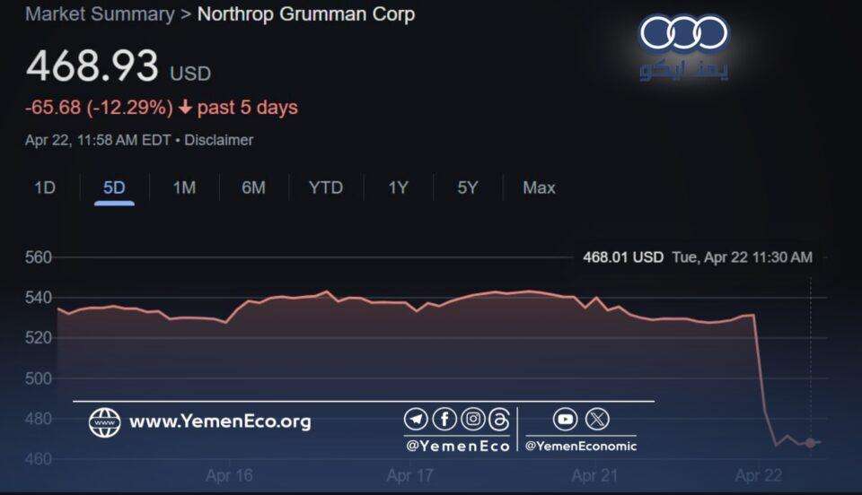 وسجل سهم شركة “نورثروب جرومان” انخفاضاً كبيراً وصل إلى 12.29%، كما انخفض سهم شركة “آر تي إكس” بنسبة وصلت إلى 8.79%، فيما انخفض سهم شركة “سييرا نيفادا” بنسبة 5.56%.