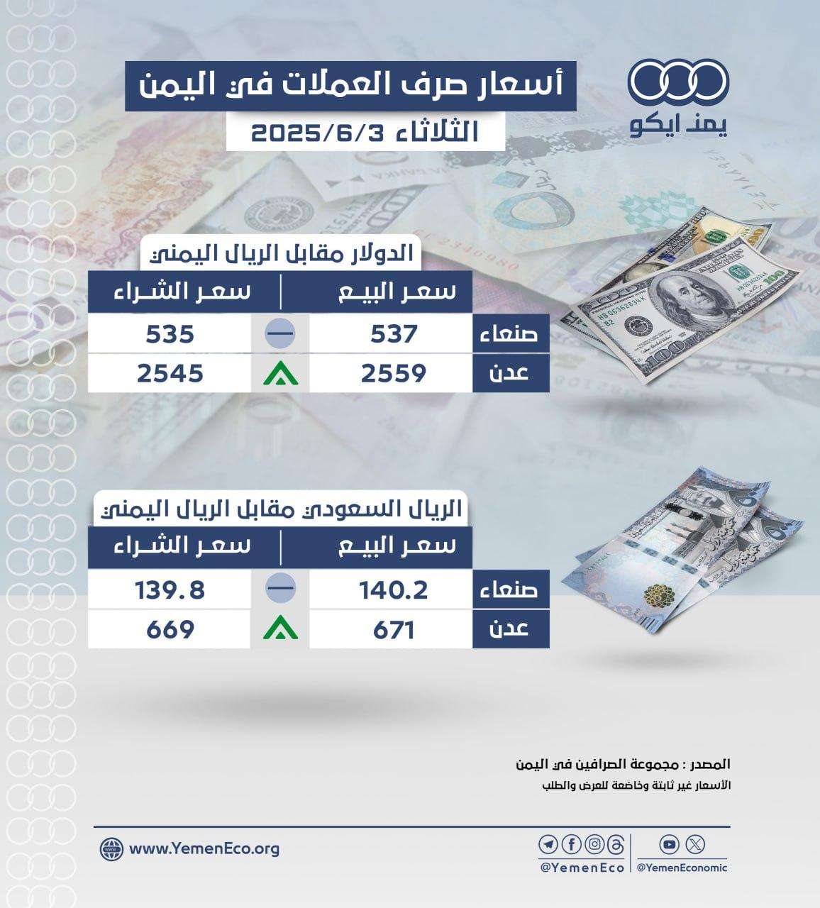 أسعار صرف العملات مقابل الريال في صنعاء وعدن: الثلاثاء 3 يونيو 2025م