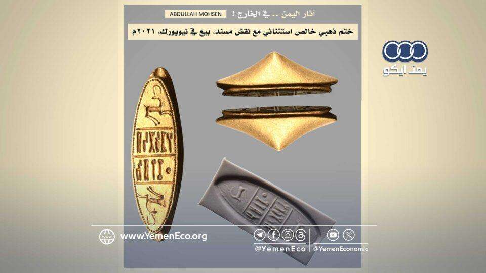 وأوضح محسن في منشور على حسابه بـ “فيسبوك”، رصده موقع “يمن إيكو”، أن القطعة المهربة هي “ختم ذهبي خالص استثنائي من آثار اليمن من القرن الرابع قبل الميلاد”.
