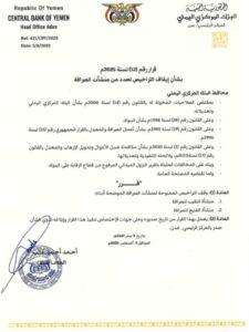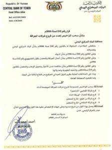 وحسب ما نشره البنك على موقعه الإلكتروني واطلع عليه موقع “يمن إيكو”، فقد قضى القرار رقم (12) بوقف التراخيص الممنوحة لمنشأتي النقيب والفنيع للصرافة، فيما نص القرار رقم (13) على سحب التراخيص الممنوحة لفروع شركات الصرافة: (القطيبي- المنصورة، الحداد- البريقة- إنماء، بن علوي- شارع التسعين، المفلحي- شارع التسعين).