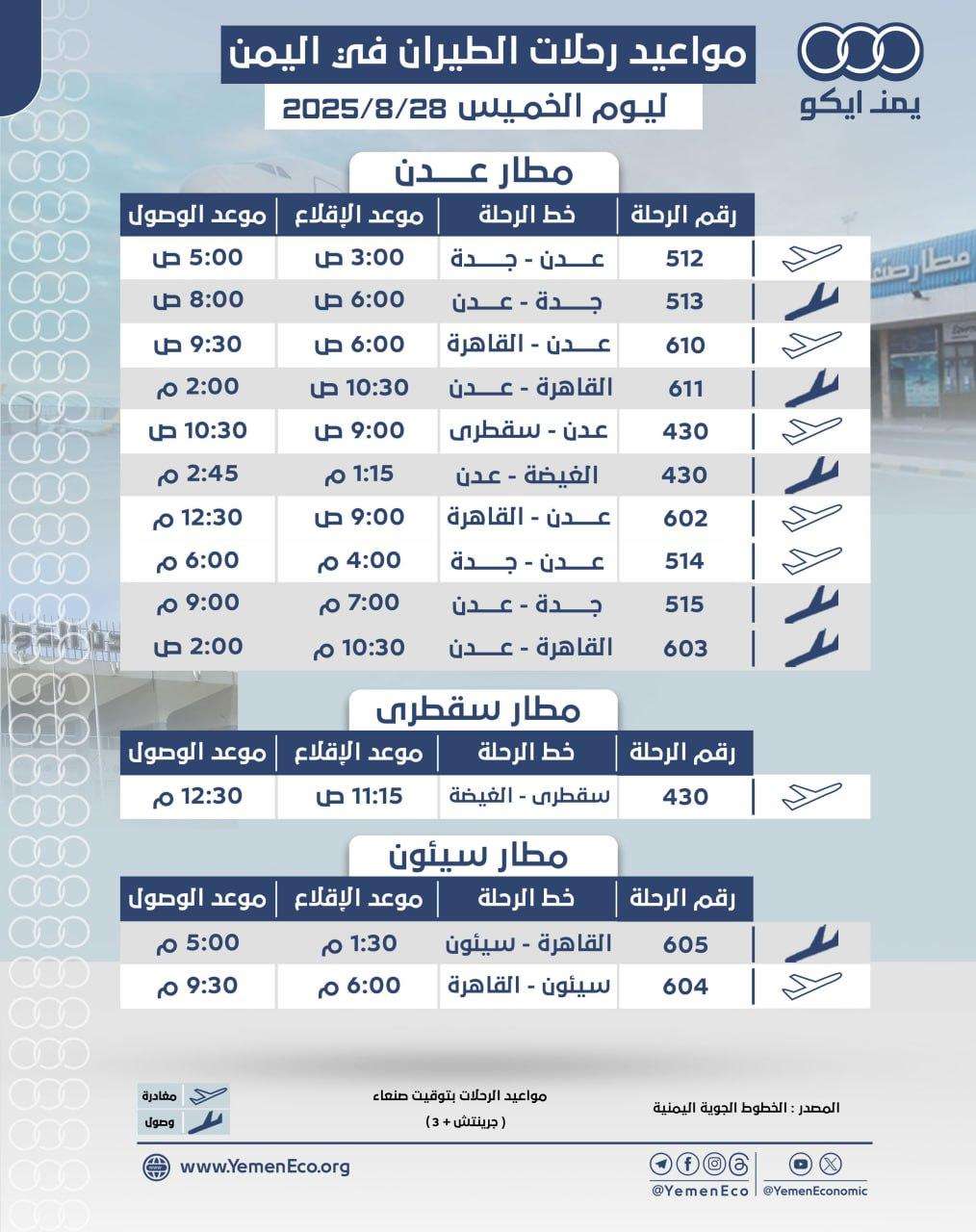 أخبارأسواقمواعيد الرحلات في ومطار عدن ومطار سقطرى مطار سيئون: الخميس 28 أغسطس 2025م 27/08/202527/08/20250355
