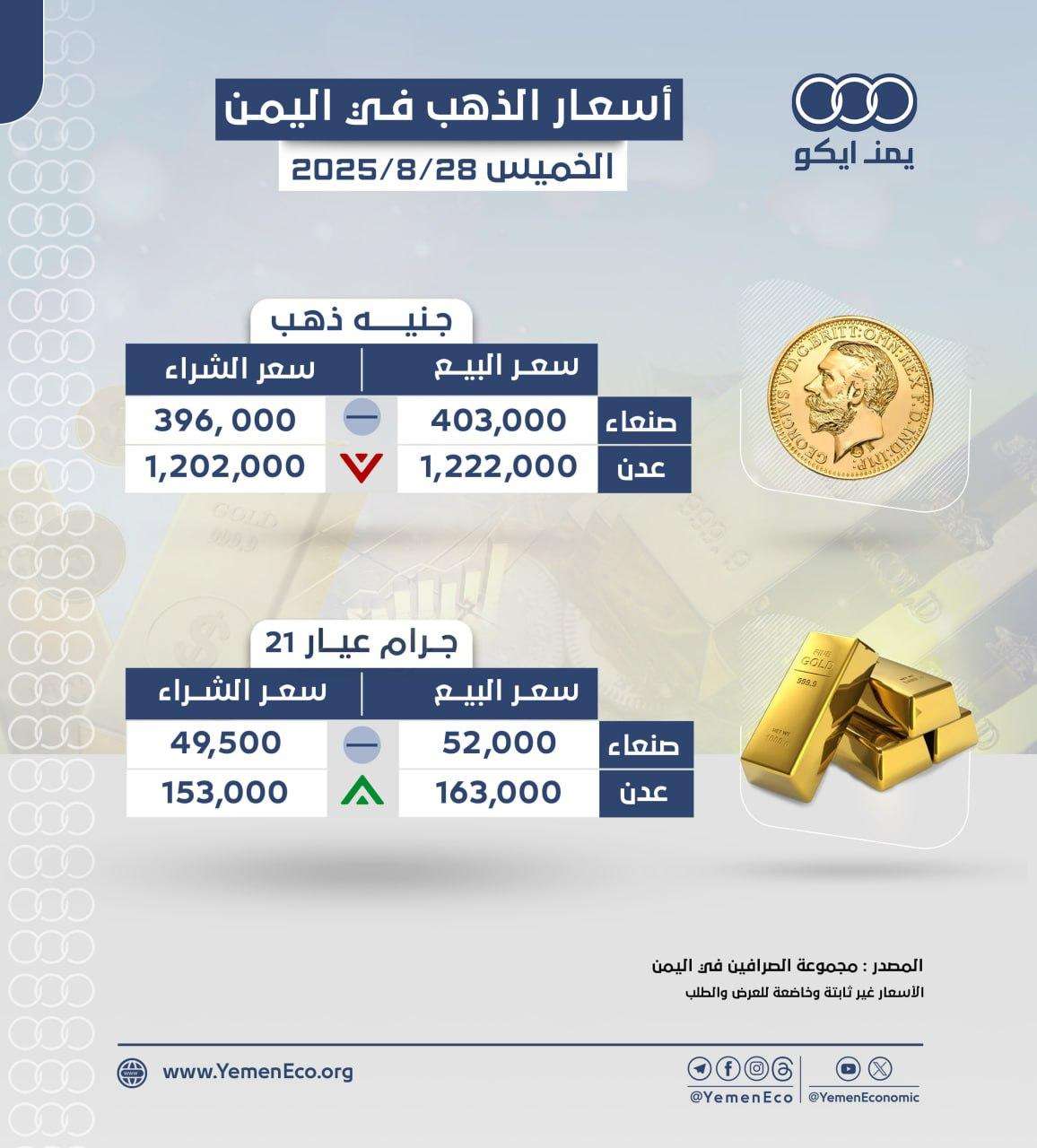 أسعار الذهب في صنعاء وعدن: الأحد 29 مارس 2026م
