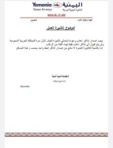 في المقابل، أكدت الوثيقة أن المسافرين بتأشيرة العمرة غير مشمولين بهذا الإجراء، إذ يمكنهم إصدار تذاكر لرحلة واحدة فقط بحسب رغبتهم، في حين دعت “اليمنية” وكالات السفر إلى الالتزام بالتعميم لضمان انسيابية الرحلات وتفادي أي إلغاء أو تأجيل للحجوزات.