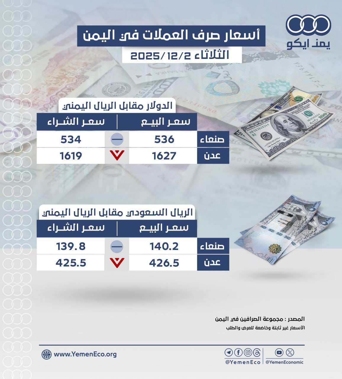 أسعار صرف العملات مقابل الريال في صنعاء وعدن: الثلاثاء 2 ديسمبر 2025م