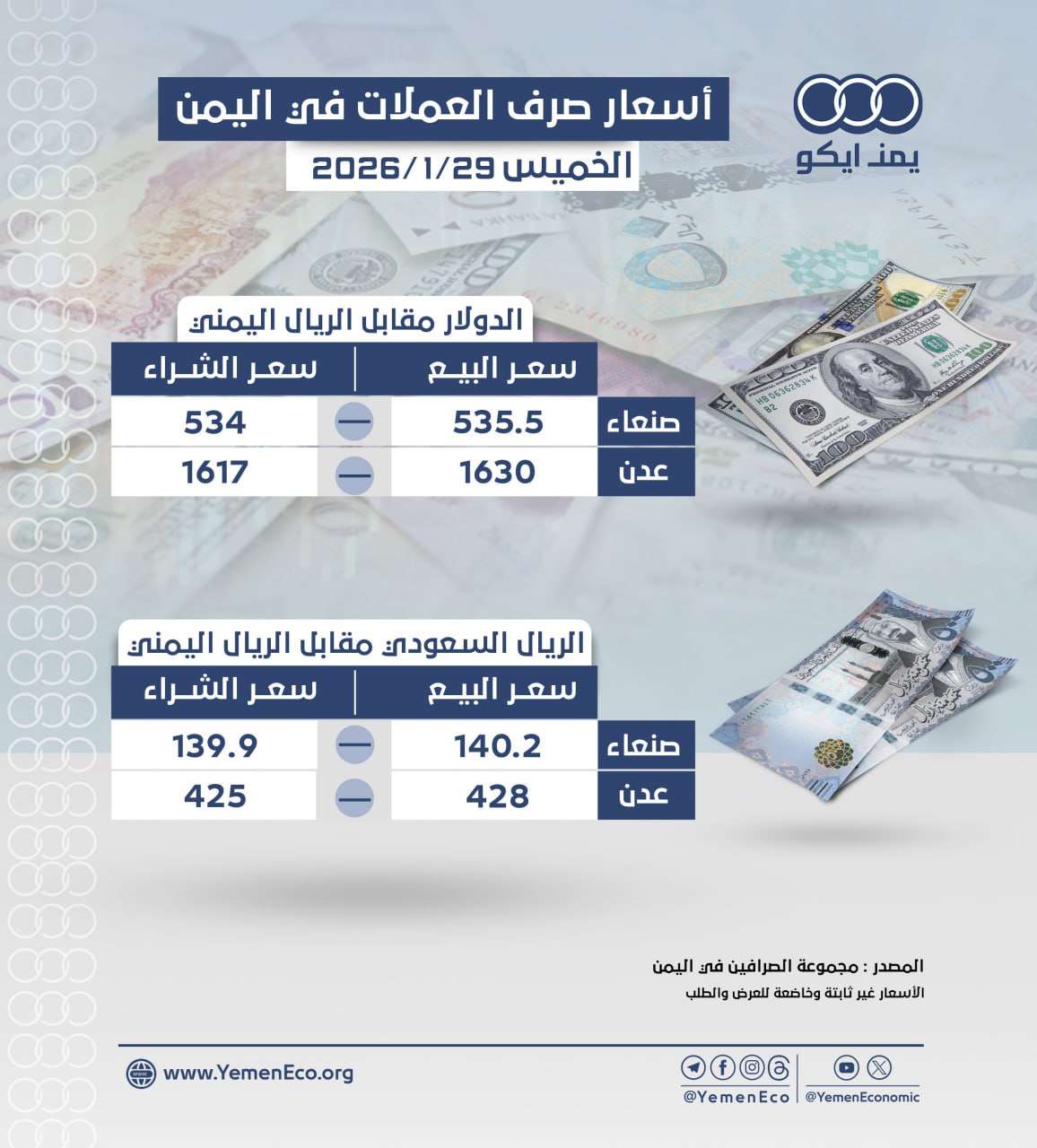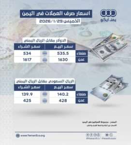 أسعار صرف العملات مقابل الريال في صنعاء وعدن: الخميس 29 يناير 2026م