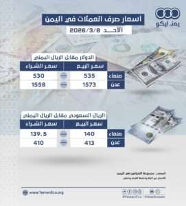 أسعار صرف العملات مقابل الريال في صنعاء وعدن: الأحد 8 مارس 2026م