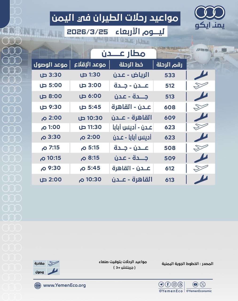 مواعيد الرحلات في مطار عدن: ليوم الأربعاء 25 مارس 2026م