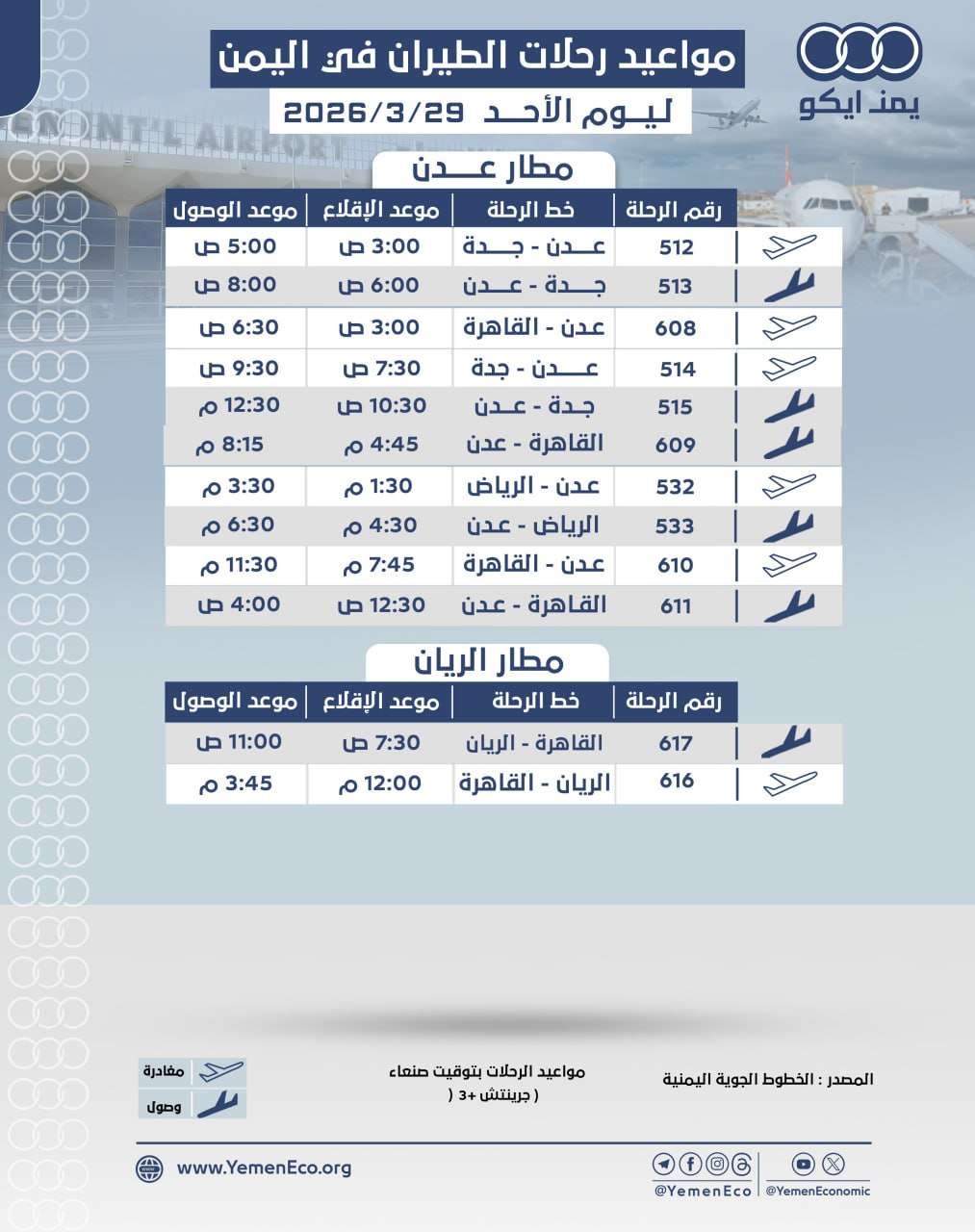 مواعيد الرحلات في مطار عدن ومطار الريان: ليوم الأحد 29 مارس 2026م