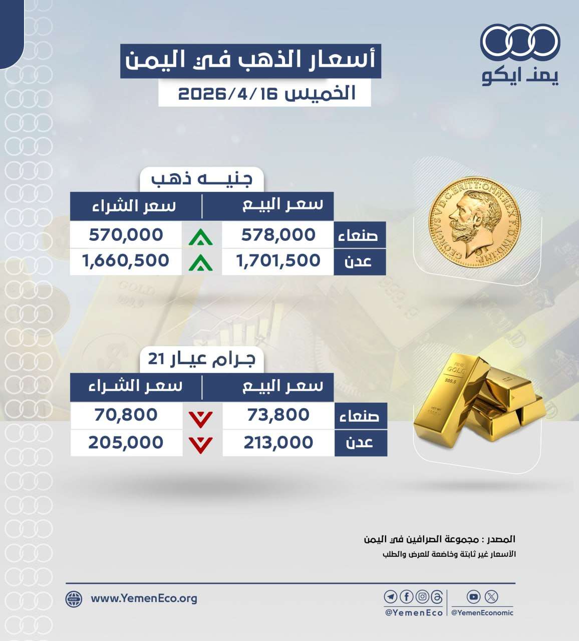 أسعار الذهب في صنعاء وعدن: الخميس 16 أبريل 2026م