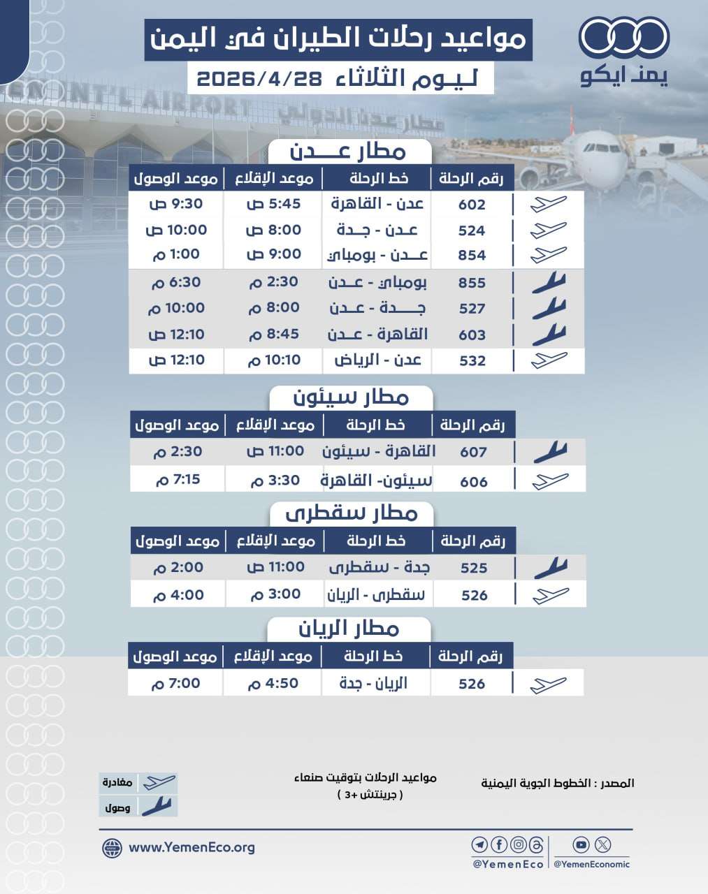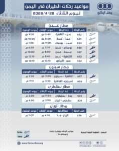أسواقمواعيد الرحلات في مطار عدن ومطار سقطرى ومطار سيئون ومطار الريان: ليوم الثلاثاء 28 أبريل 2026م 27/04/202627/04/2026013