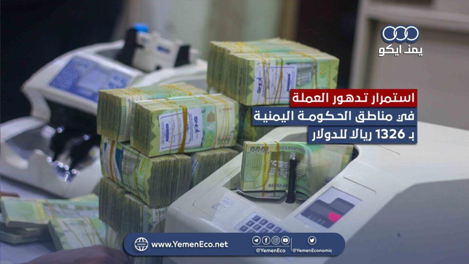 ووفقا لتداولات السوق اليوم الأحد، فقد سجل الريال في عدن وغيرها من مناطق سيطرة الحكومة اليمنية الموالية للتحالف سعرا جديدا في مساره الهابط، بـ 1326ريالاً للدولار الواحد، و349 أمام الريال السعودي.