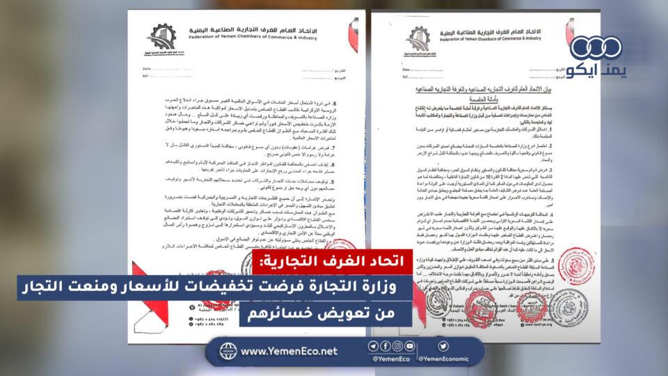 وأعرب البيان الصادر عن الاتحاد العام للغرف التجارية والغرفة التجارية بأمانة العاصمة- حصل “يمن إيكو” على نسخة منه- عن استنكاره لما تتعرض له الشركات التجارية من إجراءات وصفوها بالتعسفية، من قبل وزارة الصناعة والتجارة والمكاتب التابعة لها.