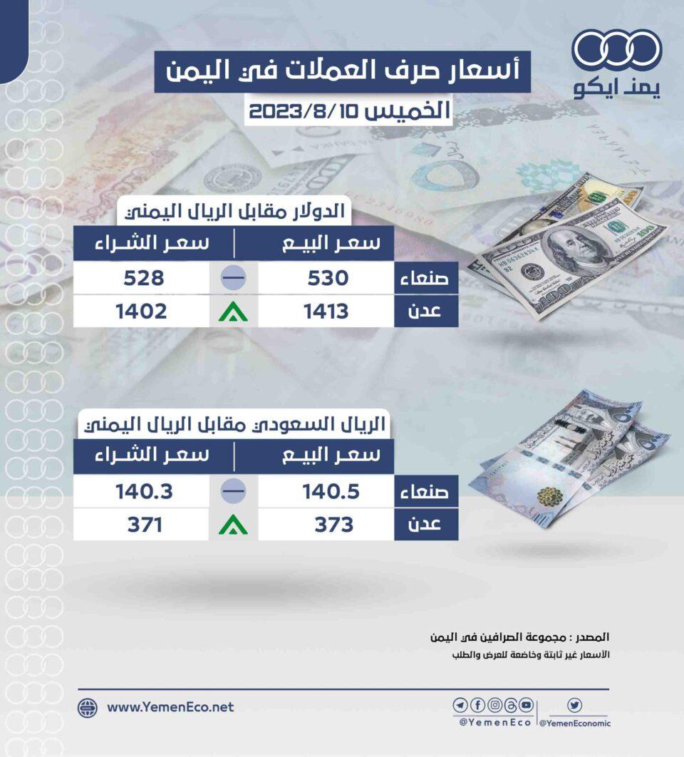 أسواق💰 أسعار صرف العملات مقابل #الريال_اليمني: الخميس 10 أغسطس 2023م 10/08/20230991 مؤشرات اليوم: عدن: ارتفع الدولار بمقدار 4 ريالات وارتفع الريال السعودي بمقدار ريال واحد