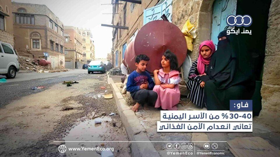 أكدت منظمة الأغذية والزراعة للأمم المتحدة “فاو” أن 30-40% من الأسر التي شملها استطلاع يوليو 2023م، في اليمن، تعاني من انعدام الأمن الغذائي.