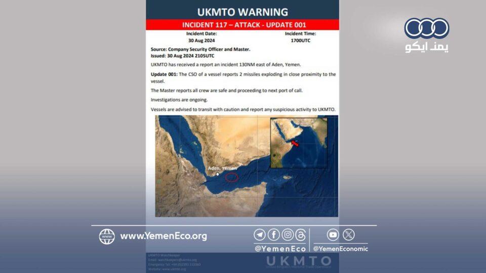 ونشرت الهيئة اليوم تحديثاً رصده موقع “يمن إيكو”، قالت فيه: أبلغ مسؤول الأمن الرئيسي في إحدى السفن عن انفجار صاروخين على مقربة من السفينة.
